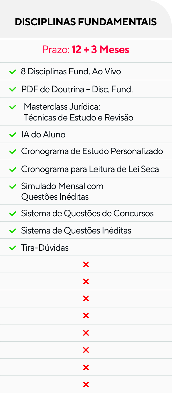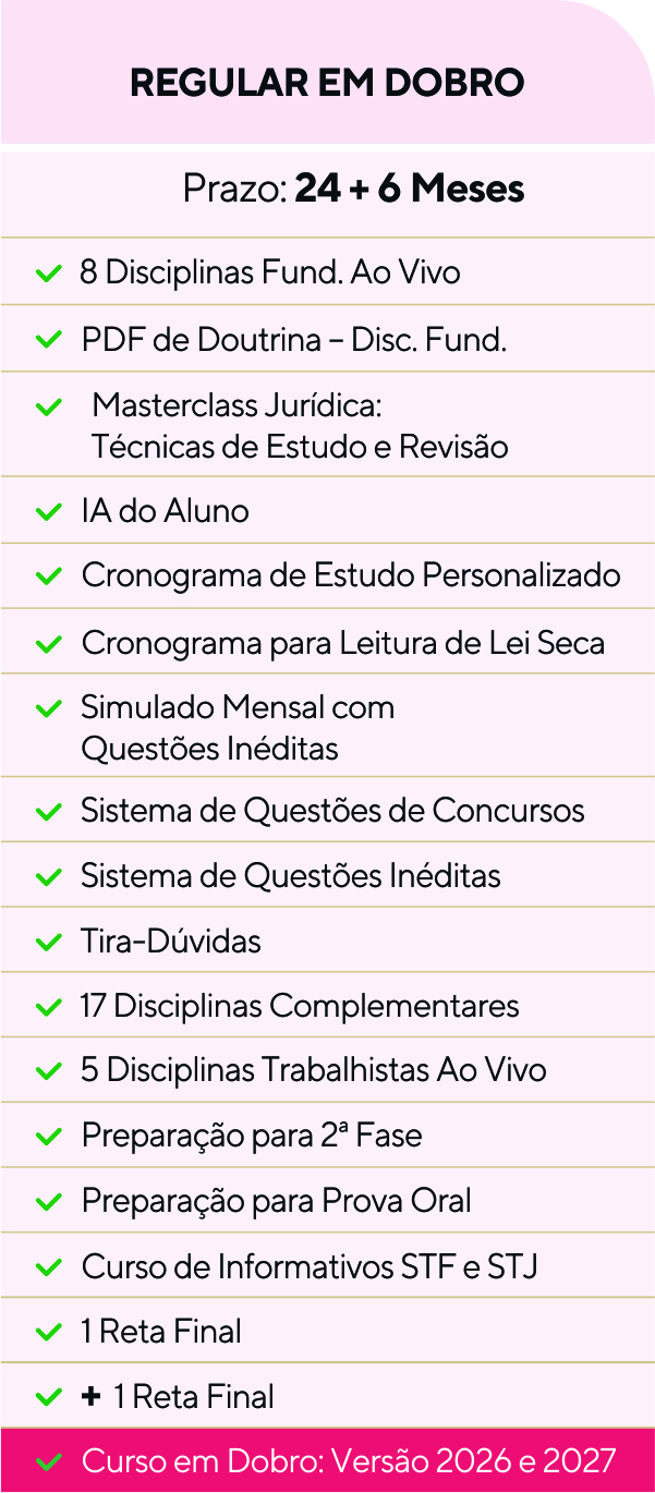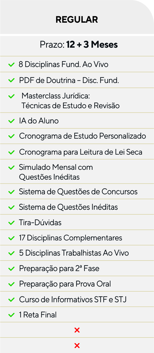 Para você que já escolheu a carreira que deseja seguir. O curso inclui: aulas ao vivo das Disciplinas Fundamentais, aulas das Disciplinas Complementares, Formação Humanística, Preparação para 2ª fase e para Prova Oral, além do Curso de Informativos STF e STJ.