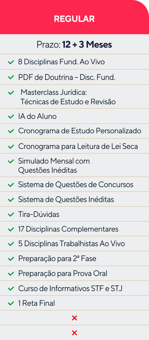 Para quem já escolheu a carreira. Inclui aulas ao vivo, disciplinas complementares, preparação completa para 2ª fase e prova oral, além do Curso de Informativos STF e STJ.