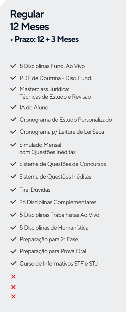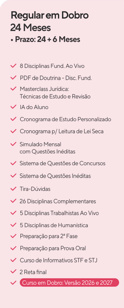 Para você que já escolheu a carreira que deseja seguir. O curso inclui: aulas ao vivo das Disciplinas Fundamentais, aulas das Disciplinas Complementares, Formação Humanística, Preparação para 2ª fase e para Prova Oral, além do Curso de Informativos STF e STJ.