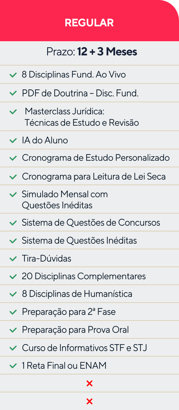 Para quem já escolheu a carreira. Inclui aulas ao vivo, disciplinas complementares, formação humanística e preparação completa para 2ª fase e prova oral, além do Curso de Informativos STF e STJ.