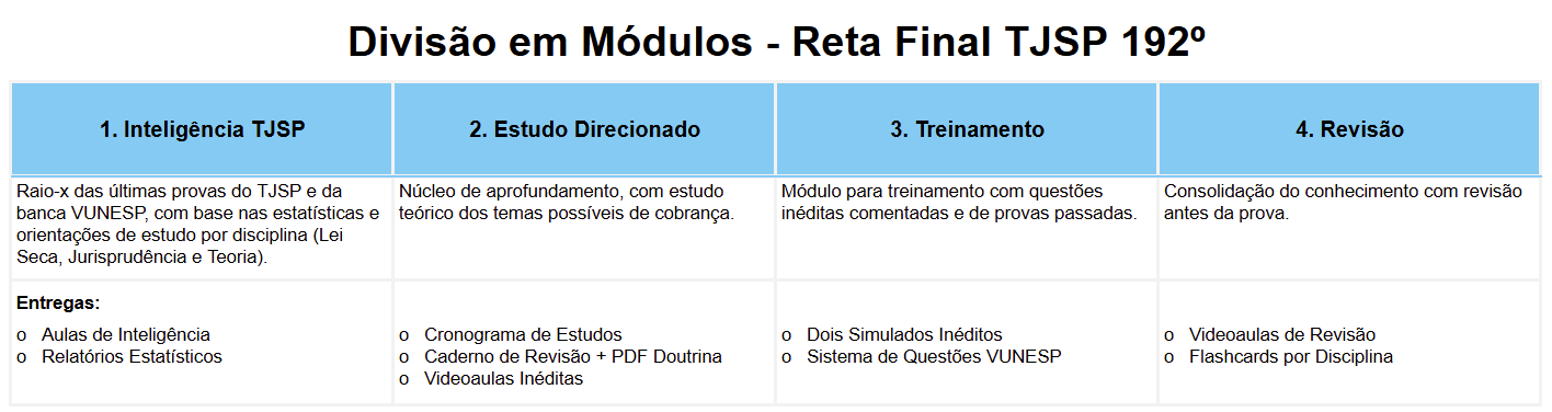 Conheça a composição do curso Reta Final TJSP, uma preparação completa e estruturada em quatro módulos: