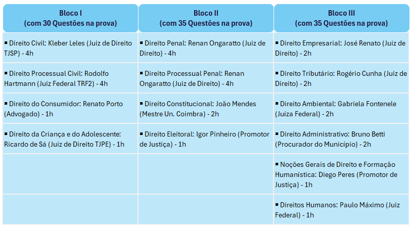 Você terá acesso a videoaulas curtas de revisão, num total de 7 horas, distribuídas entre todas as disciplinas presentes na fase objetiva, organizadas para a semana que antecede a prova, funcionando como uma última imersão nos assuntos mais relevantes. Além disso, disponibilizaremos PDFs em formato "flaschcard" — uma revisão rápida, certeira e de alta retenção.