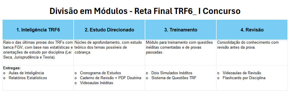 Conheça a composição do curso Reta Final TRF6, uma preparação completa e estruturada em quatro módulos: