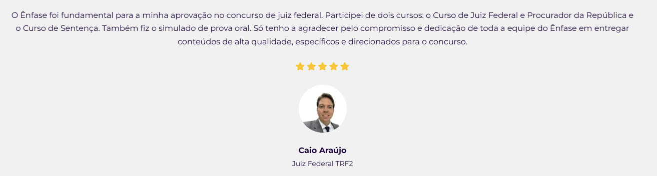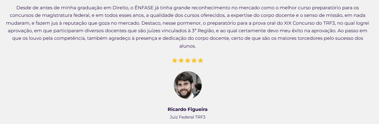No Curso Ênfase, acreditamos que o maior reconhecimento da nossa metodologia está nos resultados alcançados pelos nossos alunos. A aprovação em um concurso tão exigente quanto o de Juiz Federal exige muito mais do que dedicação — requer estratégia, direção e preparação inteligente. É por isso que temos orgulho de compartilhar os relatos de ex-alunos que trilharam essa jornada conosco e conquistaram uma das carreiras jurídicas mais almejadas do país.