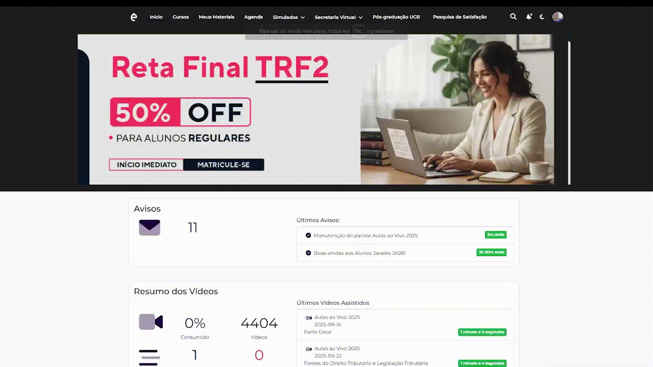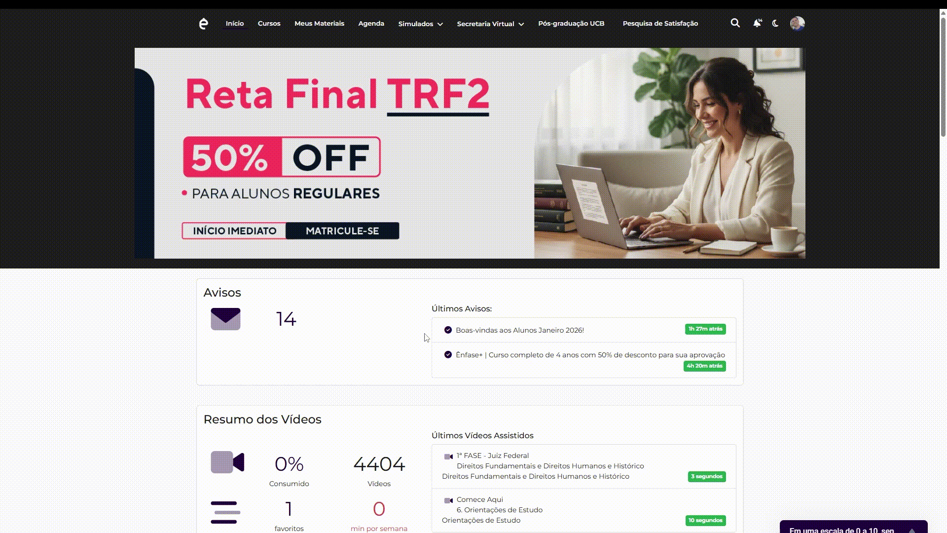 Os avisos aparecem logo na parte central do Portal assim que você acessa. E para garantir que nada passe despercebido, uma cópia também é enviada diretamente para o seu e-mail. Dica: consulte essa área regularmente. Estar bem-informado é um passo estratégico rumo à aprovação.
