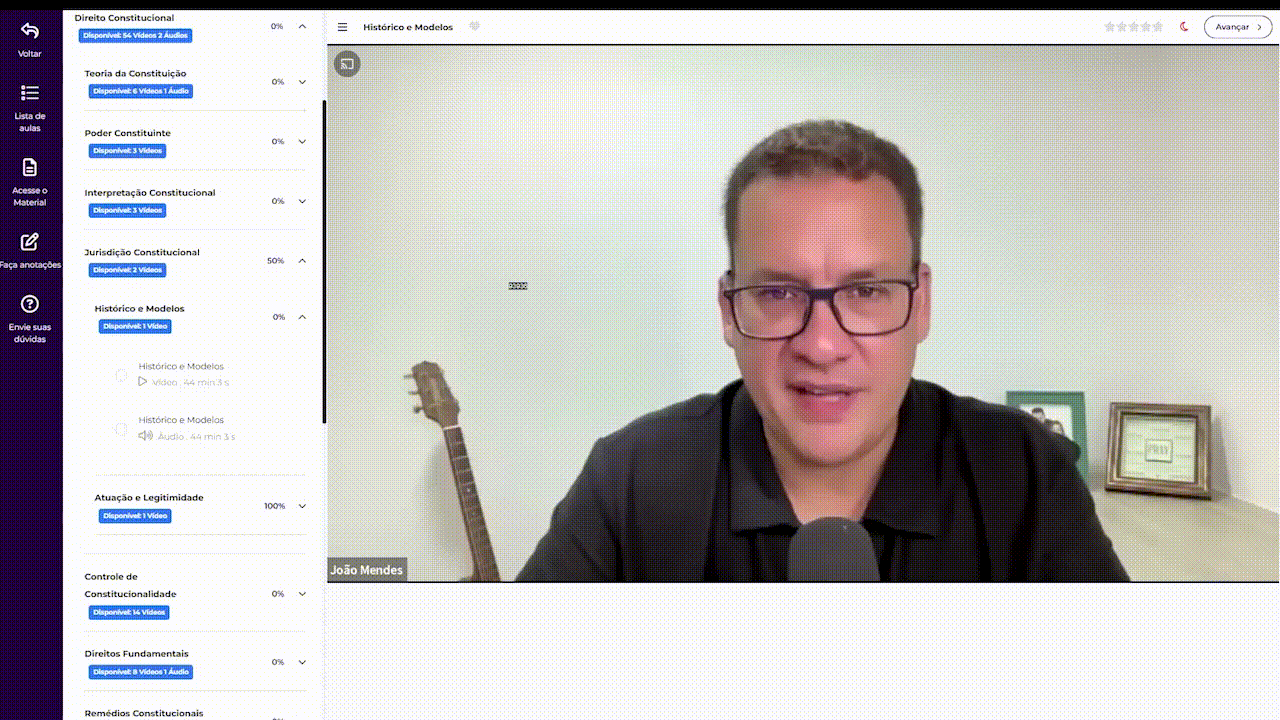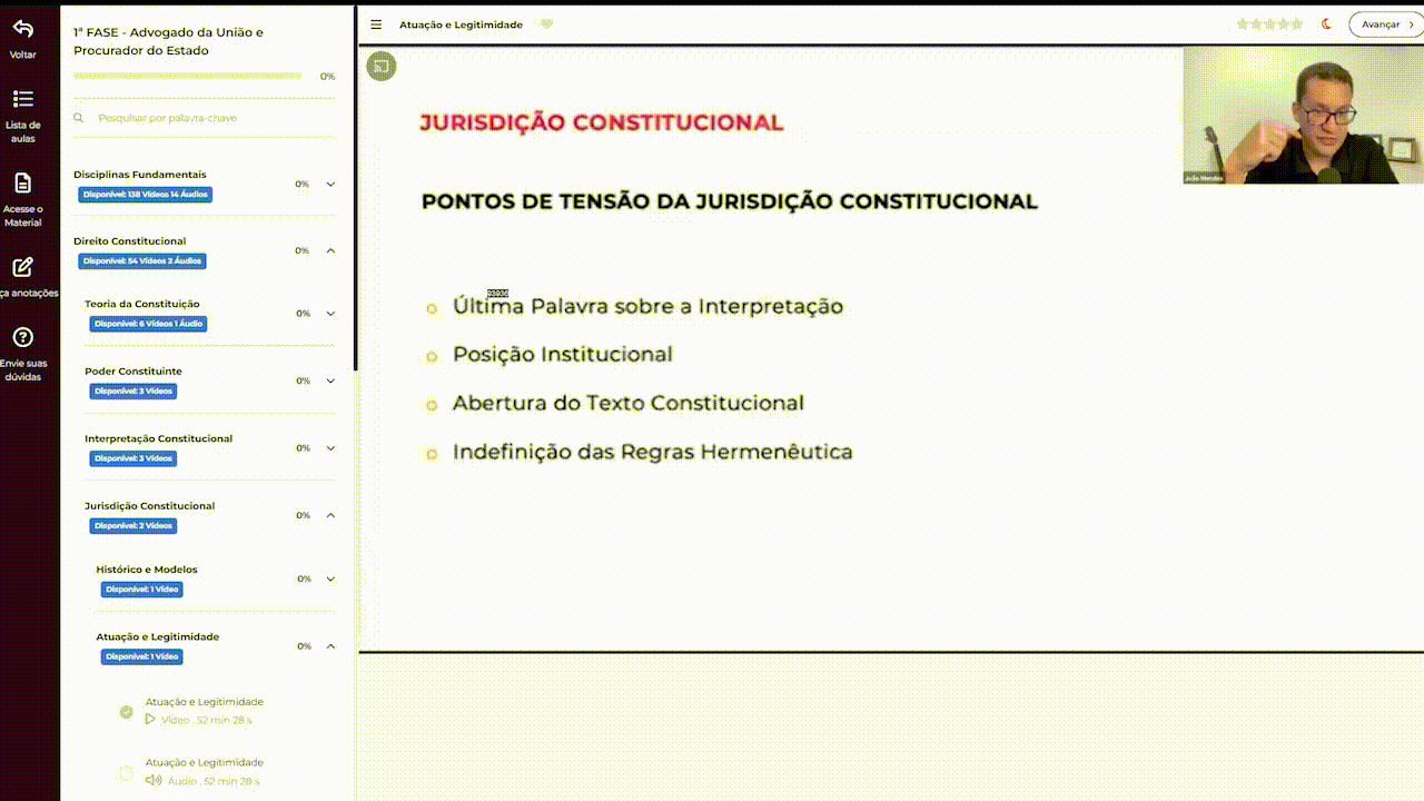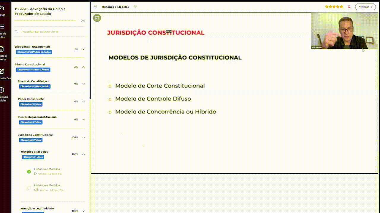 Disciplinas Fundamentais > Direito Constitucional > Teoria da Constituição > Constitucionalismo e Neoconstitucionalismo – Parte 1, chegando até o vídeo da aula.