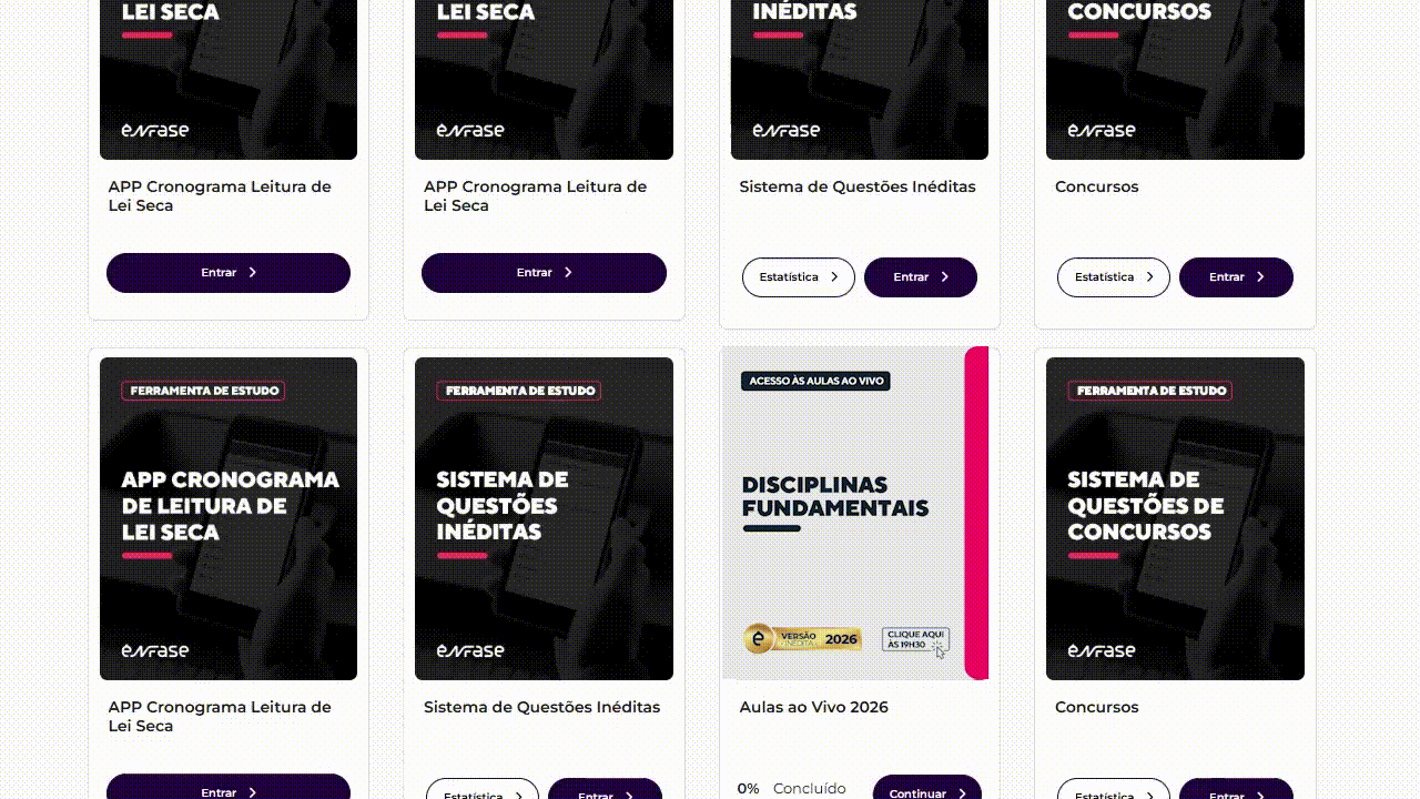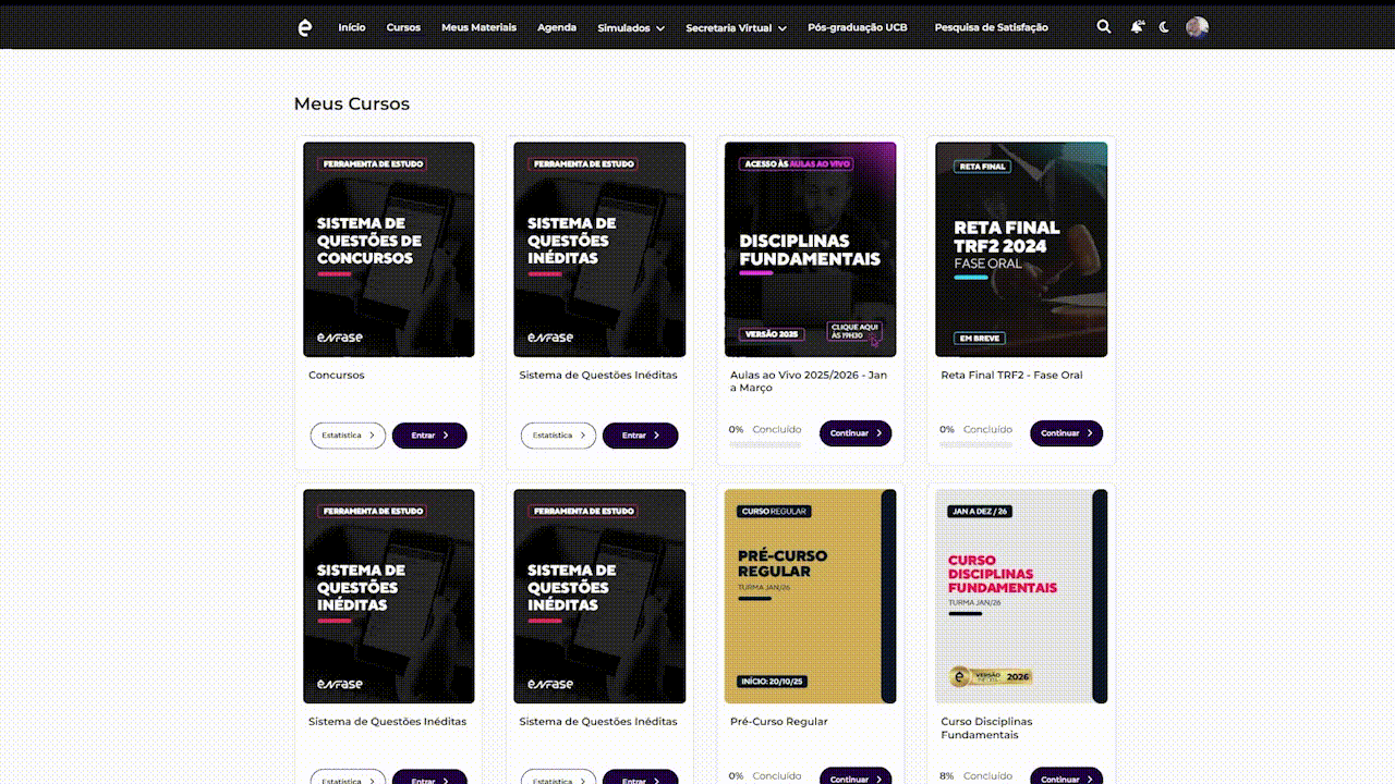 Neste espaço, você encontra todas as aulas organizadas por disciplinas e temas. As transmissões Ao Vivo são editadas e divididas por assunto, o que facilita a revisão e acelera o aprendizado.